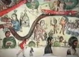 The work includes many scenes which make light of Christianity, including one where Jesus is getting a blow job.   The woman had smashed the glass display case and was busy ripping up the picture when she was arrested.