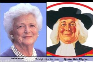 In his recent book, which should have been called Derision Points, because it is page after page of mockably untrue nonsense (admission – I haven’t read it. However, plenty of columnists have printed excerpts, with examples of provably, easily provably false statements). In that book, he recounts one incident where his mother, Barbara Bush, the one who looks like the old guy on the box of Quaker Oats, showed him a jar which contained a fetus, the result of her miscarriage.