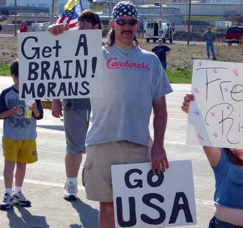 you people do realize the red neck in the picture holding the sign about “morans” is talking about MORAN. do your research please.