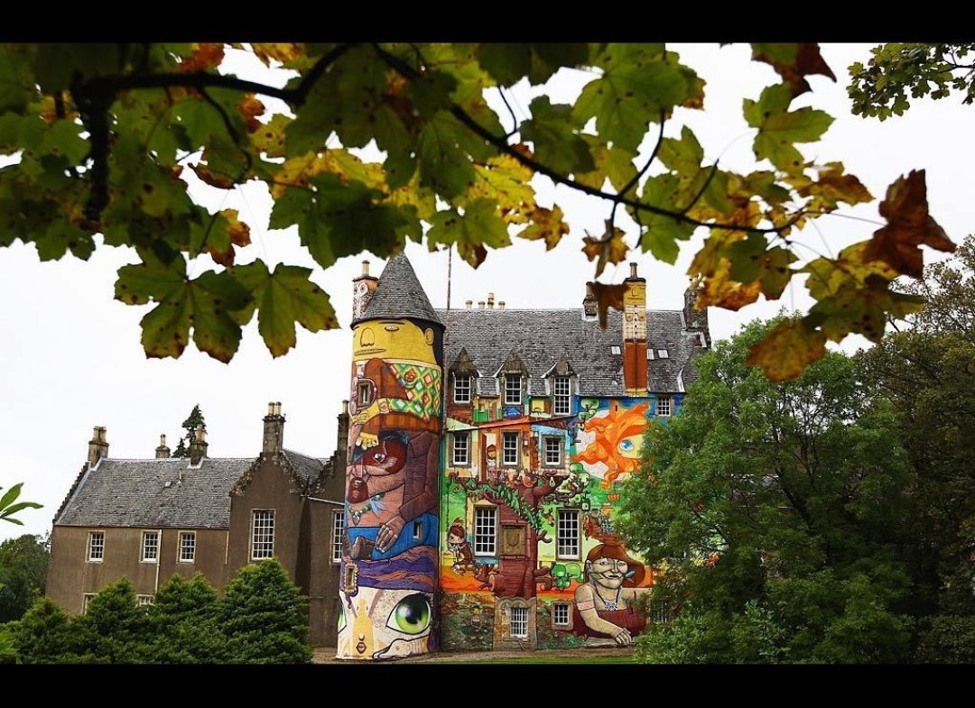 But, to those who are bound to say “but it’s a castle, this is a desecration of Scottish heritage, even if it is a private residence, they are making a mockery of tradition and history,” I say, as you tour around Europe, castles and cathedrals are a dime a bloody dozen, drive down the road apiece, you’ll see another one, and after a while they all look the same so I’ve got no objection whatsoever to the Old Hippie Laird of the Manor who wanted to add a dash of color to his surroundings, and I support his bid to have it declared a local landmark -with art intact. Actually, it is a local landmark either way, so whether to leave the artwork or not is the only question.