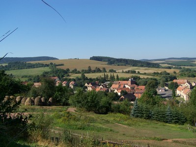 We crossed back over the freeway and saw a sign that said Prague, but we must have taken a wrong turn somewhere.  After driving through 4 or 5 villages with unpronounceable names and getting stuck behind a tractor and a cart full of grass, we finally asked a couple of young men directions in the town of Konětopy.