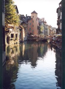We found free parking in Annecy, although it was a tight squeeze, and walked across the street to the lake and went for a swim. (I knew we were truly in France when I saw the toilet. Yup, a squatter.) Then we walked into town. It’s kind of an amazing place, actually. They’ve taken great advantage of the little river coming out at the bottom of the lake, channeled in into a series of canals and scenic falls and pools, with plenty of ducks and swans swimming around, little bridges going across, and plenty of shops and restaurants to keep the tourists occupied. We stopped at a bakery, got some sandwiches and some desserts, took them to a playground and had a nice lunch, then started walking back to the car. We had planned to be back at 6 to have dinner at 7 and go see my brother and nephew’s band rehearse at 8.