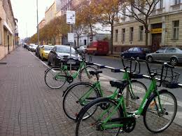 We went for a bike ride on Sunday and it was really nice. There’s this system in Prague 8, where they have bike racks and you can take one out, you can get a yearly card or you can set it up over the internet and have a pin code, and you drop it off at any other rack, and it isn’t expensive at all. They are big and green and they have a big spike on the front of them that attaches them to the rack and its like pulling a shopping cart out of the shopping cart scrunch.