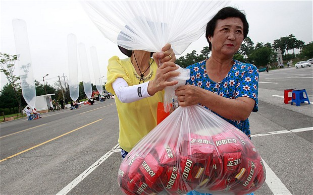 In South Korea today they launched 50 large helium balloons carrying 10,000 ‘choco pies,’ a popular South Korean snack which has been banned in the North. They launched them from a town on the border, and presumably at a moment when the wind was favorable.